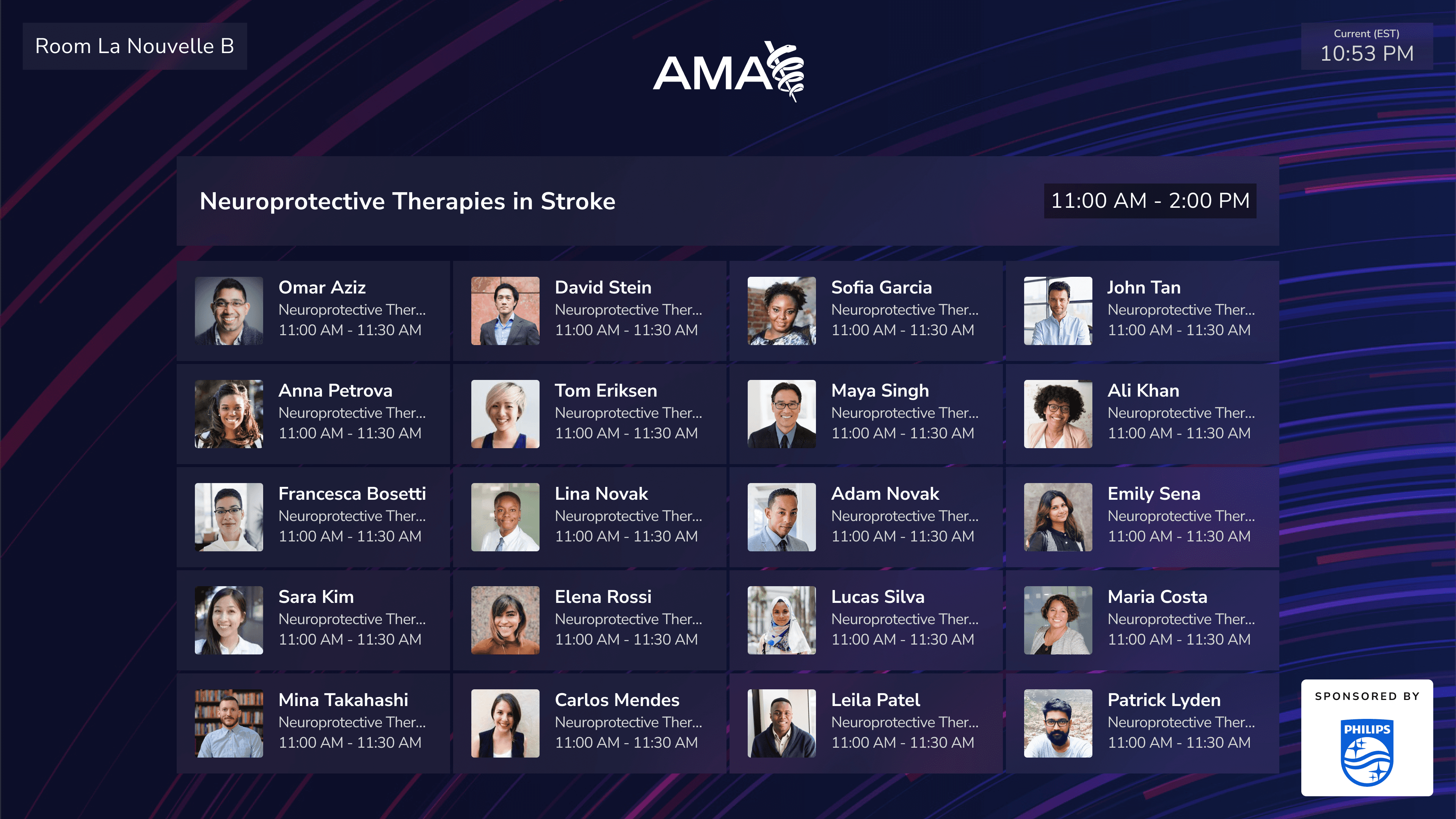 Fluid audience display accommodates 1 to 20+ speakers.